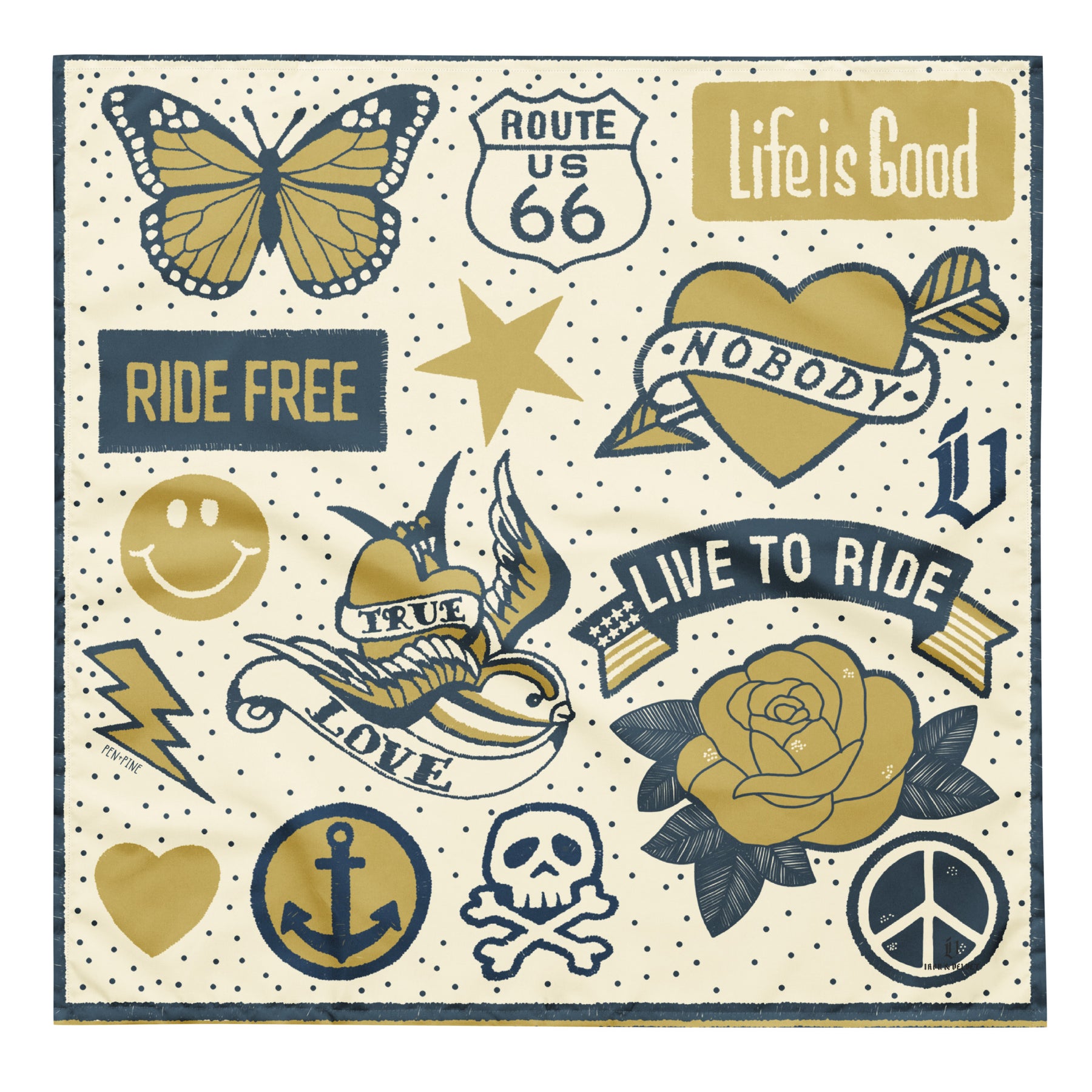 This bandana is packed with vintage tattoo-inspired artwork celebrating the open road and rebellious spirit. Every symbol tells a story of freedom, love, rebellion, and the journey that matters most. Wear it around your neck, head, or wrist. Tie it to your bag or bike. Get one for your dog. This bandana works as hard as you do.